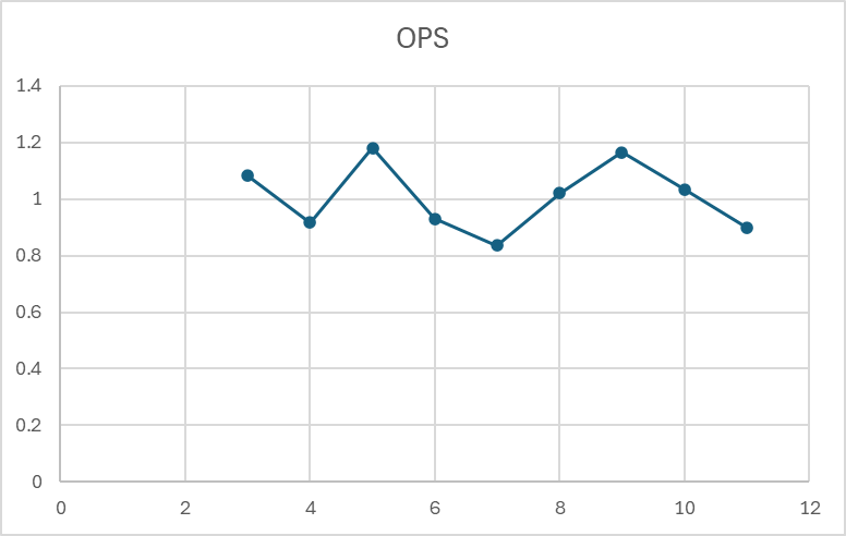 大谷の2023〜2025年のMLB成績は、OPS1.000前後を維持している。